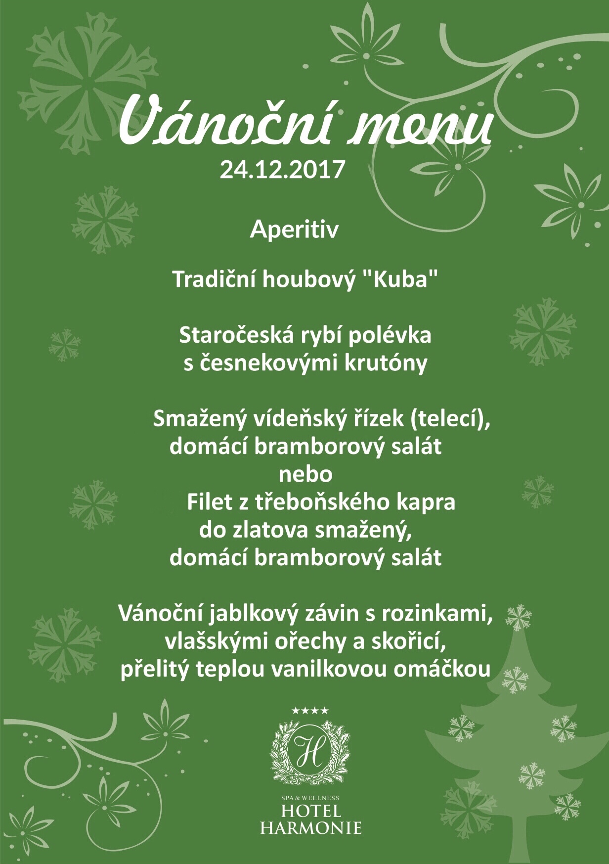 večeře ve svátečních dnech 25. a 26. 12. 2017: 1 večeře 290,-Kč/osoba, dítě 3-8 let ( 7,99let ) 150,-Kč